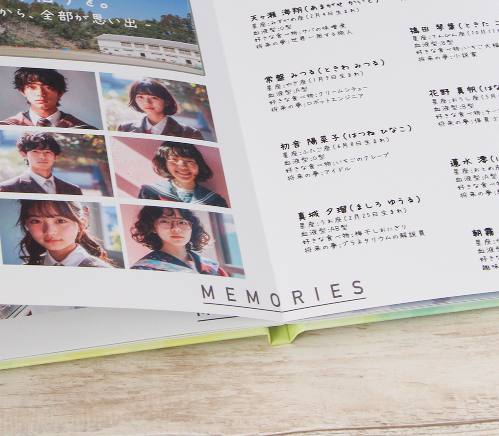 弊社の卒アル人気NO.1 の「ハードカバーA4H(通常紙)」と「ハードカバーA4H(光沢紙)」「レイフラットA4H」をお選びいただけます。なお、写真や内容は見本用のもので、お客様のデータでは作成いたしませんのでご了承ください。