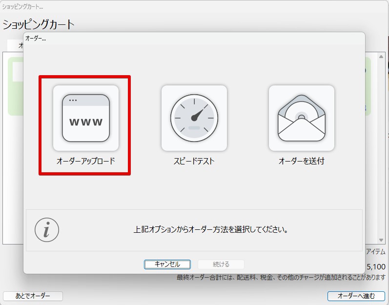 編集データをフォトレボに送付します。一番左側「オーダーをアップロード」を押して「続ける」を押してください。