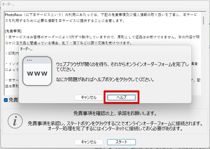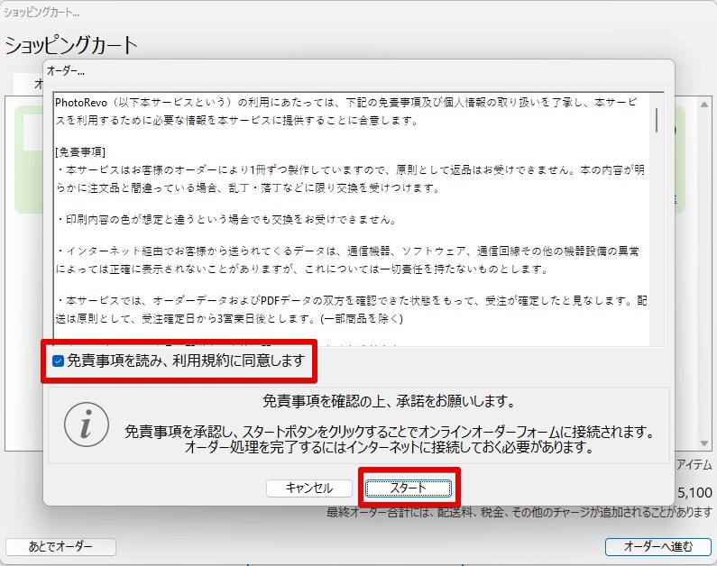 (1)免責事項を読み、利用規約に同意します。のチェックを押して「スタート」を押してください。